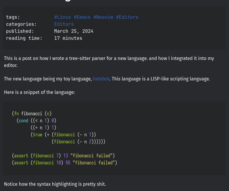 The colorscheme I wanted was a very dark almost black theme, with flat/matte colors. They don’t pop, but provide enough constrast for HTML elements to differentiate themselves.