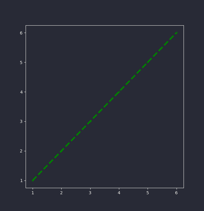 1plt.plot(x_coodinates,y_coordinates,label='Line',linestyle='--',linewidth=3.5,marker='+',color='g')